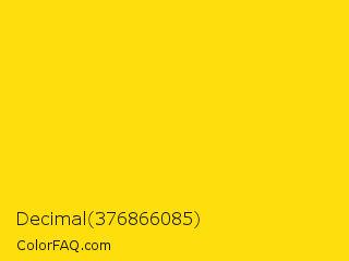 Decimal 376866085 Color is a normal yellow color and the nearest color is Lemon #fde910. Hex code #ffde0d and RGB value is rgb(255,222,13). In RGB color space, this color is composed of 100% red, 87% green, 5% blue, In CMYK color space, this color is composed of 0% cyan, 13% magenta, 95% yellow , 0% black , In HSL color space, this color has a hue angle of 52° , 100% saturation and 53% lightness.