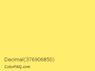 Decimal 376906850 Color is a light yellow color and the nearest color is Festival #fbe96c. Hex code #ffed6e and RGB value is rgb(255,237,110). In RGB color space, this color is composed of 100% red, 93% green, 43% blue, In CMYK color space, this color is composed of 0% cyan, 7% magenta, 57% yellow , 0% black , In HSL color space, this color has a hue angle of 53° , 100% saturation and 72% lightness.