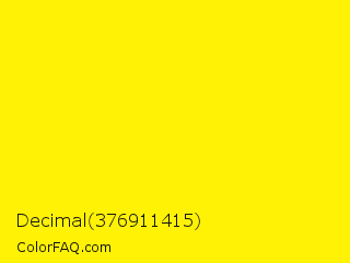 Decimal 376911415 Color is a normal yellow color and the nearest color is Yellow Rose #fff000. Hex code #fff205 and RGB value is rgb(255,242,5). In RGB color space, this color is composed of 100% red, 95% green, 2% blue, In CMYK color space, this color is composed of 0% cyan, 5% magenta, 98% yellow , 0% black , In HSL color space, this color has a hue angle of 57° , 100% saturation and 51% lightness.