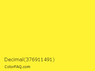 Decimal 376911491 Color is a normal yellow color and the nearest color is Maximum Yellow #fafa37. Hex code #fff233 and RGB value is rgb(255,242,51). In RGB color space, this color is composed of 100% red, 95% green, 20% blue, In CMYK color space, this color is composed of 0% cyan, 5% magenta, 80% yellow , 0% black , In HSL color space, this color has a hue angle of 56° , 100% saturation and 60% lightness.