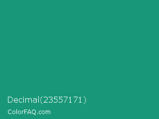Decimal 23557171 Color is a normal cyan color and the nearest color is Green Crayola #1cac78. Hex code #199879 and RGB value is rgb(25,152,121). In RGB color space, this color is composed of 10% red, 60% green, 47% blue, In CMYK color space, this color is composed of 84% cyan, 0% magenta, 20% yellow , 40% black , In HSL color space, this color has a hue angle of 165° , 72% saturation and 35% lightness.