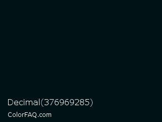 Decimal 376969285 Color is a almost black cyan color and the nearest color is Blue Charcoal #010d1a. Hex code #001215 and RGB value is rgb(0,18,21). In RGB color space, this color is composed of 0% red, 7% green, 8% blue, In CMYK color space, this color is composed of 100% cyan, 14% magenta, 0% yellow , 92% black , In HSL color space, this color has a hue angle of 189° , 100% saturation and 4% lightness.