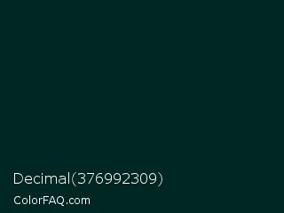Decimal 376992309 Color is a almost black cyan color and the nearest color is Burnham #002e20. Hex code #002723 and RGB value is rgb(0,39,35). In RGB color space, this color is composed of 0% red, 15% green, 14% blue, In CMYK color space, this color is composed of 100% cyan, 0% magenta, 10% yellow , 85% black , In HSL color space, this color has a hue angle of 174° , 100% saturation and 8% lightness.