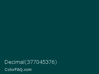 Decimal 377045376 Color is a very dark cyan color and the nearest color is Warm Black #004242. Hex code #004244 and RGB value is rgb(0,66,68). In RGB color space, this color is composed of 0% red, 26% green, 27% blue, In CMYK color space, this color is composed of 100% cyan, 3% magenta, 0% yellow , 73% black , In HSL color space, this color has a hue angle of 182° , 100% saturation and 13% lightness.