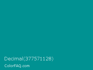 Decimal 377571128 Color is a dark cyan color and the nearest color is Viridian Green #009698. Hex code #009292 and RGB value is rgb(0,146,146). In RGB color space, this color is composed of 0% red, 57% green, 57% blue, In CMYK color space, this color is composed of 100% cyan, 0% magenta, 0% yellow , 43% black , In HSL color space, this color has a hue angle of 180° , 100% saturation and 29% lightness.