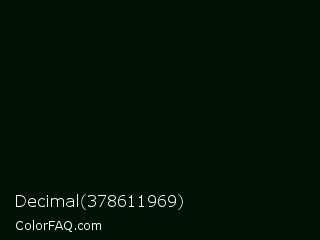 Decimal 378611969 Color is a almost black green color and the nearest color is Midnight Moss #041004. Hex code #021205 and RGB value is rgb(2,18,5). In RGB color space, this color is composed of 1% red, 7% green, 2% blue, In CMYK color space, this color is composed of 89% cyan, 0% magenta, 72% yellow , 93% black , In HSL color space, this color has a hue angle of 131° , 80% saturation and 4% lightness.