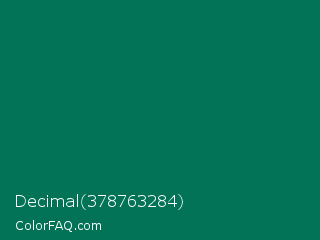 Decimal 378763284 Color is a dark cyan color and the nearest color is Watercourse #056f57. Hex code #027356 and RGB value is rgb(2,115,86). In RGB color space, this color is composed of 1% red, 45% green, 34% blue, In CMYK color space, this color is composed of 98% cyan, 0% magenta, 25% yellow , 55% black , In HSL color space, this color has a hue angle of 165° , 97% saturation and 23% lightness.