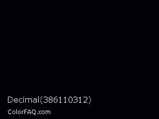 Decimal 386110312 Color is a almost black violet color and the nearest color is Rich Black FOGRA39 #010203. Hex code #040008 and RGB value is rgb(4,0,8). In RGB color space, this color is composed of 2% red, 0% green, 3% blue, In CMYK color space, this color is composed of 50% cyan, 100% magenta, 0% yellow , 97% black , In HSL color space, this color has a hue angle of 270° , 100% saturation and 2% lightness.
