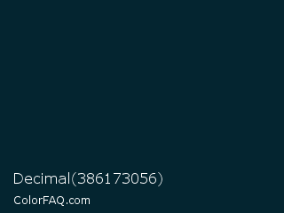 Decimal 386173056 Color is a very dark blue color and the nearest color is Daintree #012731. Hex code #042530 and RGB value is rgb(4,37,48). In RGB color space, this color is composed of 2% red, 15% green, 19% blue, In CMYK color space, this color is composed of 92% cyan, 23% magenta, 0% yellow , 81% black , In HSL color space, this color has a hue angle of 195° , 85% saturation and 10% lightness.