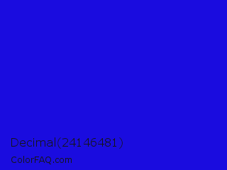 Decimal 24146481 Color is a normal indigo color and the nearest color is Bluebonnet #1c1cf0. Hex code #1a0cdf and RGB value is rgb(26,12,223). In RGB color space, this color is composed of 10% red, 5% green, 87% blue, In CMYK color space, this color is composed of 88% cyan, 95% magenta, 0% yellow , 13% black , In HSL color space, this color has a hue angle of 244° , 90% saturation and 46% lightness.