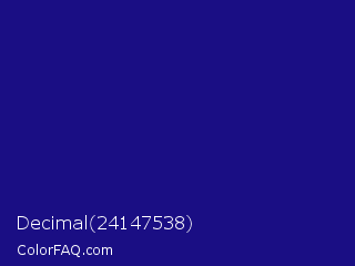 Decimal 24147538 Color is a dark indigo color and the nearest color is Deep Koamaru #1b127b. Hex code #1a0e84 and RGB value is rgb(26,14,132). In RGB color space, this color is composed of 10% red, 5% green, 52% blue, In CMYK color space, this color is composed of 80% cyan, 89% magenta, 0% yellow , 48% black , In HSL color space, this color has a hue angle of 246° , 81% saturation and 29% lightness.