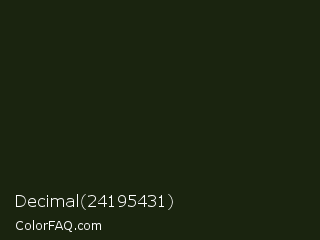 Decimal 24195431 Color is a very dark green color and the nearest color is Rangoon Green #1c1e13. Hex code #1a240f and RGB value is rgb(26,36,15). In RGB color space, this color is composed of 10% red, 14% green, 6% blue, In CMYK color space, this color is composed of 28% cyan, 0% magenta, 58% yellow , 86% black , In HSL color space, this color has a hue angle of 89° , 41% saturation and 10% lightness.