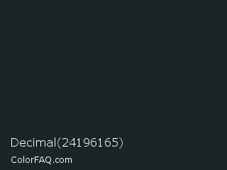 Decimal 24196165 Color is a very dark cyan color and the nearest color is Dark Jungle Green #1a2421. Hex code #1a2525 and RGB value is rgb(26,37,37). In RGB color space, this color is composed of 10% red, 15% green, 15% blue, In CMYK color space, this color is composed of 30% cyan, 0% magenta, 0% yellow , 85% black , In HSL color space, this color has a hue angle of 180° , 17% saturation and 12% lightness.