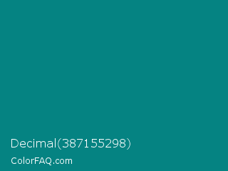 Decimal 387155298 Color is a dark cyan color and the nearest color is Teal Green #00827f. Hex code #058382 and RGB value is rgb(5,131,130). In RGB color space, this color is composed of 2% red, 51% green, 51% blue, In CMYK color space, this color is composed of 96% cyan, 0% magenta, 1% yellow , 49% black , In HSL color space, this color has a hue angle of 180° , 93% saturation and 27% lightness.