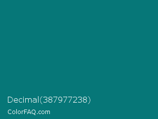 Decimal 387977238 Color is a dark cyan color and the nearest color is Surfie Green #0c7a79. Hex code #067778 and RGB value is rgb(6,119,120). In RGB color space, this color is composed of 2% red, 47% green, 47% blue, In CMYK color space, this color is composed of 95% cyan, 1% magenta, 0% yellow , 53% black , In HSL color space, this color has a hue angle of 181° , 90% saturation and 25% lightness.