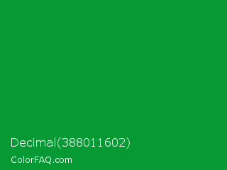 Decimal 388011602 Color is a normal green color and the nearest color is North Texas Green #059033. Hex code #069934 and RGB value is rgb(6,153,52). In RGB color space, this color is composed of 2% red, 60% green, 20% blue, In CMYK color space, this color is composed of 96% cyan, 0% magenta, 66% yellow , 40% black , In HSL color space, this color has a hue angle of 139° , 92% saturation and 31% lightness.