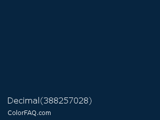 Decimal 388257028 Color is a very dark blue color and the nearest color is Oxford Blue #002147. Hex code #072540 and RGB value is rgb(7,37,64). In RGB color space, this color is composed of 3% red, 15% green, 25% blue, In CMYK color space, this color is composed of 89% cyan, 42% magenta, 0% yellow , 75% black , In HSL color space, this color has a hue angle of 208° , 80% saturation and 14% lightness.