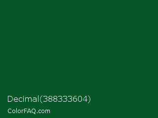 Decimal 388333604 Color is a very dark green color and the nearest color is Camarone #00581a. Hex code #075628 and RGB value is rgb(7,86,40). In RGB color space, this color is composed of 3% red, 34% green, 16% blue, In CMYK color space, this color is composed of 92% cyan, 0% magenta, 53% yellow , 66% black , In HSL color space, this color has a hue angle of 145° , 85% saturation and 18% lightness.