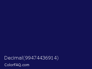 Decimal 99474436914 Color is a very dark indigo color and the nearest color is Gulf Blue #051657. Hex code #121154 and RGB value is rgb(18,17,84). In RGB color space, this color is composed of 7% red, 7% green, 33% blue, In CMYK color space, this color is composed of 79% cyan, 80% magenta, 0% yellow , 67% black , In HSL color space, this color has a hue angle of 241° , 66% saturation and 20% lightness.