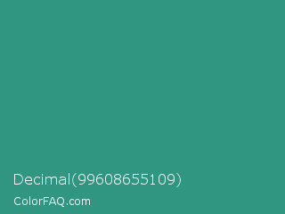 Decimal 99608655109 Color is a normal cyan color and the nearest color is Lochinvar #2c8c84. Hex code #309681 and RGB value is rgb(48,150,129). In RGB color space, this color is composed of 19% red, 59% green, 51% blue, In CMYK color space, this color is composed of 68% cyan, 0% magenta, 14% yellow , 41% black , In HSL color space, this color has a hue angle of 168° , 52% saturation and 39% lightness.