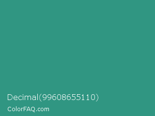 Decimal 99608655110 Color is a normal cyan color and the nearest color is Lochinvar #2c8c84. Hex code #309682 and RGB value is rgb(48,150,130). In RGB color space, this color is composed of 19% red, 59% green, 51% blue, In CMYK color space, this color is composed of 68% cyan, 0% magenta, 13% yellow , 41% black , In HSL color space, this color has a hue angle of 168° , 52% saturation and 39% lightness.