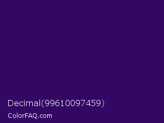 Decimal 99610097459 Color is a very dark violet color and the nearest color is Christalle #33036b. Hex code #330865 and RGB value is rgb(51,8,101). In RGB color space, this color is composed of 20% red, 3% green, 40% blue, In CMYK color space, this color is composed of 50% cyan, 92% magenta, 0% yellow , 60% black , In HSL color space, this color has a hue angle of 268° , 85% saturation and 21% lightness.