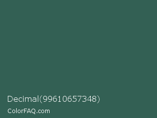 Decimal 99610657348 Color is a dark cyan color and the nearest color is Stromboli #325d52. Hex code #336054 and RGB value is rgb(51,96,84). In RGB color space, this color is composed of 20% red, 38% green, 33% blue, In CMYK color space, this color is composed of 47% cyan, 0% magenta, 13% yellow , 62% black , In HSL color space, this color has a hue angle of 164° , 31% saturation and 29% lightness.