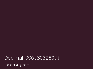 Decimal 99613032807 Color is a very dark rose color and the nearest color is Jon #3b1f1f. Hex code #371927 and RGB value is rgb(55,25,39). In RGB color space, this color is composed of 22% red, 10% green, 15% blue, In CMYK color space, this color is composed of 0% cyan, 55% magenta, 29% yellow , 78% black , In HSL color space, this color has a hue angle of 332° , 38% saturation and 16% lightness.