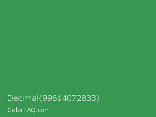 Decimal 99614072833 Color is a normal green color and the nearest color is Sea Green #2e8b57. Hex code #389751 and RGB value is rgb(56,151,81). In RGB color space, this color is composed of 22% red, 59% green, 32% blue, In CMYK color space, this color is composed of 63% cyan, 0% magenta, 46% yellow , 41% black , In HSL color space, this color has a hue angle of 136° , 46% saturation and 41% lightness.