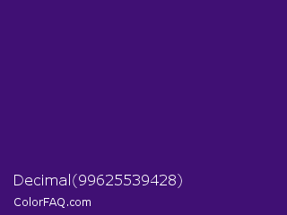 Decimal 99625539428 Color is a dark violet color and the nearest color is Windsor #3c0878. Hex code #401074 and RGB value is rgb(64,16,116). In RGB color space, this color is composed of 25% red, 6% green, 45% blue, In CMYK color space, this color is composed of 45% cyan, 86% magenta, 0% yellow , 55% black , In HSL color space, this color has a hue angle of 269° , 76% saturation and 26% lightness.