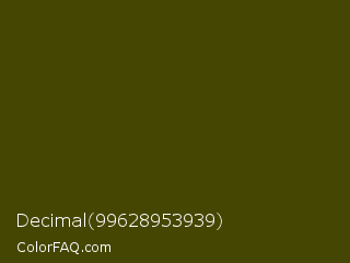 Decimal 99628953939 Color is a very dark yellow color and the nearest color is Verdun Green #495400. Hex code #454601 and RGB value is rgb(69,70,1). In RGB color space, this color is composed of 27% red, 27% green, 0% blue, In CMYK color space, this color is composed of 1% cyan, 0% magenta, 99% yellow , 73% black , In HSL color space, this color has a hue angle of 61° , 97% saturation and 14% lightness.
