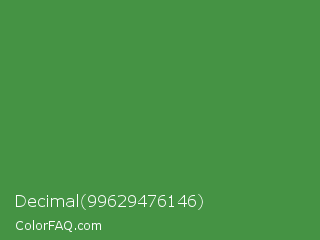 Decimal 99629476146 Color is a normal green color and the nearest color is May Green #4c9141. Hex code #459344 and RGB value is rgb(69,147,68). In RGB color space, this color is composed of 27% red, 58% green, 27% blue, In CMYK color space, this color is composed of 53% cyan, 0% magenta, 54% yellow , 42% black , In HSL color space, this color has a hue angle of 119° , 37% saturation and 42% lightness.