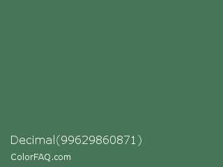 Decimal 99629860871 Color is a normal green color and the nearest color is Amazon #3b7a57. Hex code #467557 and RGB value is rgb(70,117,87). In RGB color space, this color is composed of 27% red, 46% green, 34% blue, In CMYK color space, this color is composed of 40% cyan, 0% magenta, 26% yellow , 54% black , In HSL color space, this color has a hue angle of 142° , 25% saturation and 37% lightness.