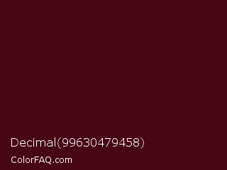 Decimal 99630479458 Color is a very dark red color and the nearest color is Cab Sav #4d0a18. Hex code #470616 and RGB value is rgb(71,6,22). In RGB color space, this color is composed of 28% red, 2% green, 9% blue, In CMYK color space, this color is composed of 0% cyan, 92% magenta, 69% yellow , 72% black , In HSL color space, this color has a hue angle of 345° , 84% saturation and 15% lightness.