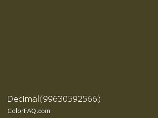 Decimal 99630592566 Color is a very dark yellow color and the nearest color is Lisbon Brown #423921. Hex code #474224 and RGB value is rgb(71,66,36). In RGB color space, this color is composed of 28% red, 26% green, 14% blue, In CMYK color space, this color is composed of 0% cyan, 7% magenta, 49% yellow , 72% black , In HSL color space, this color has a hue angle of 51° , 33% saturation and 21% lightness.