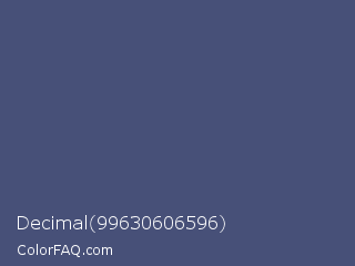 Decimal 99630606596 Color is a normal blue color and the nearest color is East Bay #414c7d. Hex code #475078 and RGB value is rgb(71,80,120). In RGB color space, this color is composed of 28% red, 31% green, 47% blue, In CMYK color space, this color is composed of 41% cyan, 33% magenta, 0% yellow , 53% black , In HSL color space, this color has a hue angle of 229° , 26% saturation and 37% lightness.