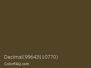 Decimal 99643110770 Color is a dark orange color and the nearest color is Black Coffee #4b3621. Hex code #504424 and RGB value is rgb(80,68,36). In RGB color space, this color is composed of 31% red, 27% green, 14% blue, In CMYK color space, this color is composed of 0% cyan, 15% magenta, 55% yellow , 69% black , In HSL color space, this color has a hue angle of 44° , 38% saturation and 23% lightness.
