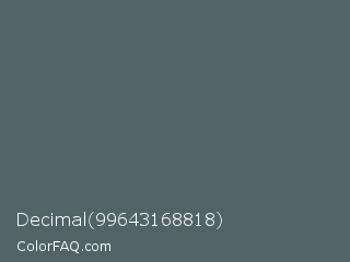Decimal 99643168818 Color is a normal cyan color and the nearest color is Stormcloud #4f666a. Hex code #506468 and RGB value is rgb(80,100,104). In RGB color space, this color is composed of 31% red, 39% green, 41% blue, In CMYK color space, this color is composed of 23% cyan, 4% magenta, 0% yellow , 59% black , In HSL color space, this color has a hue angle of 190° , 13% saturation and 36% lightness.