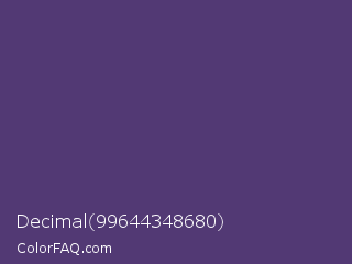 Decimal 99644348680 Color is a normal violet color and the nearest color is Cyber Grape #58427c. Hex code #523974 and RGB value is rgb(82,57,116). In RGB color space, this color is composed of 32% red, 22% green, 45% blue, In CMYK color space, this color is composed of 29% cyan, 51% magenta, 0% yellow , 55% black , In HSL color space, this color has a hue angle of 265° , 34% saturation and 34% lightness.