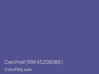 Decimal 99645208086 Color is a normal indigo color and the nearest color is Victoria #534491. Hex code #535190 and RGB value is rgb(83,81,144). In RGB color space, this color is composed of 33% red, 32% green, 56% blue, In CMYK color space, this color is composed of 42% cyan, 44% magenta, 0% yellow , 44% black , In HSL color space, this color has a hue angle of 242° , 28% saturation and 44% lightness.