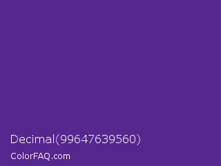 Decimal 99647639560 Color is a normal violet color and the nearest color is KSU Purple #512888. Hex code #572790 and RGB value is rgb(87,39,144). In RGB color space, this color is composed of 34% red, 15% green, 56% blue, In CMYK color space, this color is composed of 40% cyan, 73% magenta, 0% yellow , 44% black , In HSL color space, this color has a hue angle of 267° , 57% saturation and 36% lightness.