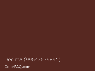Decimal 99647639891 Color is a dark red color and the nearest color is Caput Mortuum #592720. Hex code #572821 and RGB value is rgb(87,40,33). In RGB color space, this color is composed of 34% red, 16% green, 13% blue, In CMYK color space, this color is composed of 0% cyan, 54% magenta, 62% yellow , 66% black , In HSL color space, this color has a hue angle of 8° , 45% saturation and 24% lightness.