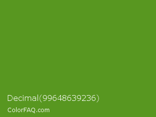 Decimal 99648639236 Color is a normal green color and the nearest color is Vida Loca #549019. Hex code #589720 and RGB value is rgb(88,151,32). In RGB color space, this color is composed of 35% red, 59% green, 13% blue, In CMYK color space, this color is composed of 42% cyan, 0% magenta, 79% yellow , 41% black , In HSL color space, this color has a hue angle of 92° , 65% saturation and 36% lightness.