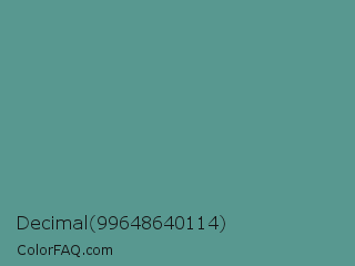Decimal 99648640114 Color is a normal cyan color and the nearest color is Patina #639a8f. Hex code #589890 and RGB value is rgb(88,152,144). In RGB color space, this color is composed of 35% red, 60% green, 56% blue, In CMYK color space, this color is composed of 42% cyan, 0% magenta, 5% yellow , 40% black , In HSL color space, this color has a hue angle of 173° , 27% saturation and 47% lightness.