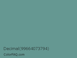 Decimal 99664073794 Color is a normal cyan color and the nearest color is Patina #639a8f. Hex code #659892 and RGB value is rgb(101,152,146). In RGB color space, this color is composed of 40% red, 60% green, 57% blue, In CMYK color space, this color is composed of 34% cyan, 0% magenta, 4% yellow , 40% black , In HSL color space, this color has a hue angle of 173° , 20% saturation and 50% lightness.