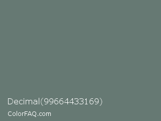 Decimal 99664433169 Color is a normal green color and the nearest color is Nevada #646e75. Hex code #667973 and RGB value is rgb(102,121,115). In RGB color space, this color is composed of 40% red, 47% green, 45% blue, In CMYK color space, this color is composed of 16% cyan, 0% magenta, 5% yellow , 53% black , In HSL color space, this color has a hue angle of 161° , 9% saturation and 44% lightness.