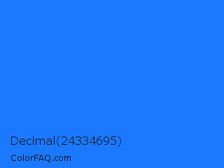 Decimal 24334695 Color is a normal blue color and the nearest color is Blue Crayola #1f75fe. Hex code #1a79ff and RGB value is rgb(26,121,255). In RGB color space, this color is composed of 10% red, 47% green, 100% blue, In CMYK color space, this color is composed of 90% cyan, 53% magenta, 0% yellow , 0% black , In HSL color space, this color has a hue angle of 215° , 100% saturation and 55% lightness.