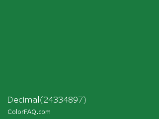 Decimal 24334897 Color is a dark green color and the nearest color is Dark Spring Green #177245. Hex code #1a7a3f and RGB value is rgb(26,122,63). In RGB color space, this color is composed of 10% red, 48% green, 25% blue, In CMYK color space, this color is composed of 79% cyan, 0% magenta, 48% yellow , 52% black , In HSL color space, this color has a hue angle of 143° , 65% saturation and 29% lightness.