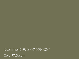 Decimal 99678189608 Color is a normal yellow color and the nearest color is Kokoda #6e6d57. Hex code #717154 and RGB value is rgb(113,113,84). In RGB color space, this color is composed of 44% red, 44% green, 33% blue, In CMYK color space, this color is composed of 0% cyan, 0% magenta, 26% yellow , 56% black , In HSL color space, this color has a hue angle of 60° , 15% saturation and 39% lightness.
