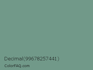 Decimal 99678257441 Color is a normal green color and the nearest color is Oxley #779e86. Hex code #719989 and RGB value is rgb(113,153,137). In RGB color space, this color is composed of 44% red, 60% green, 54% blue, In CMYK color space, this color is composed of 26% cyan, 0% magenta, 10% yellow , 40% black , In HSL color space, this color has a hue angle of 156° , 16% saturation and 52% lightness.